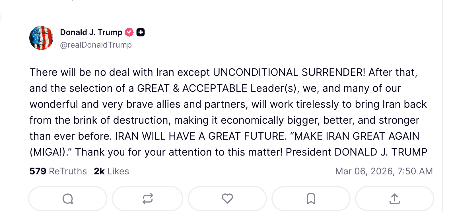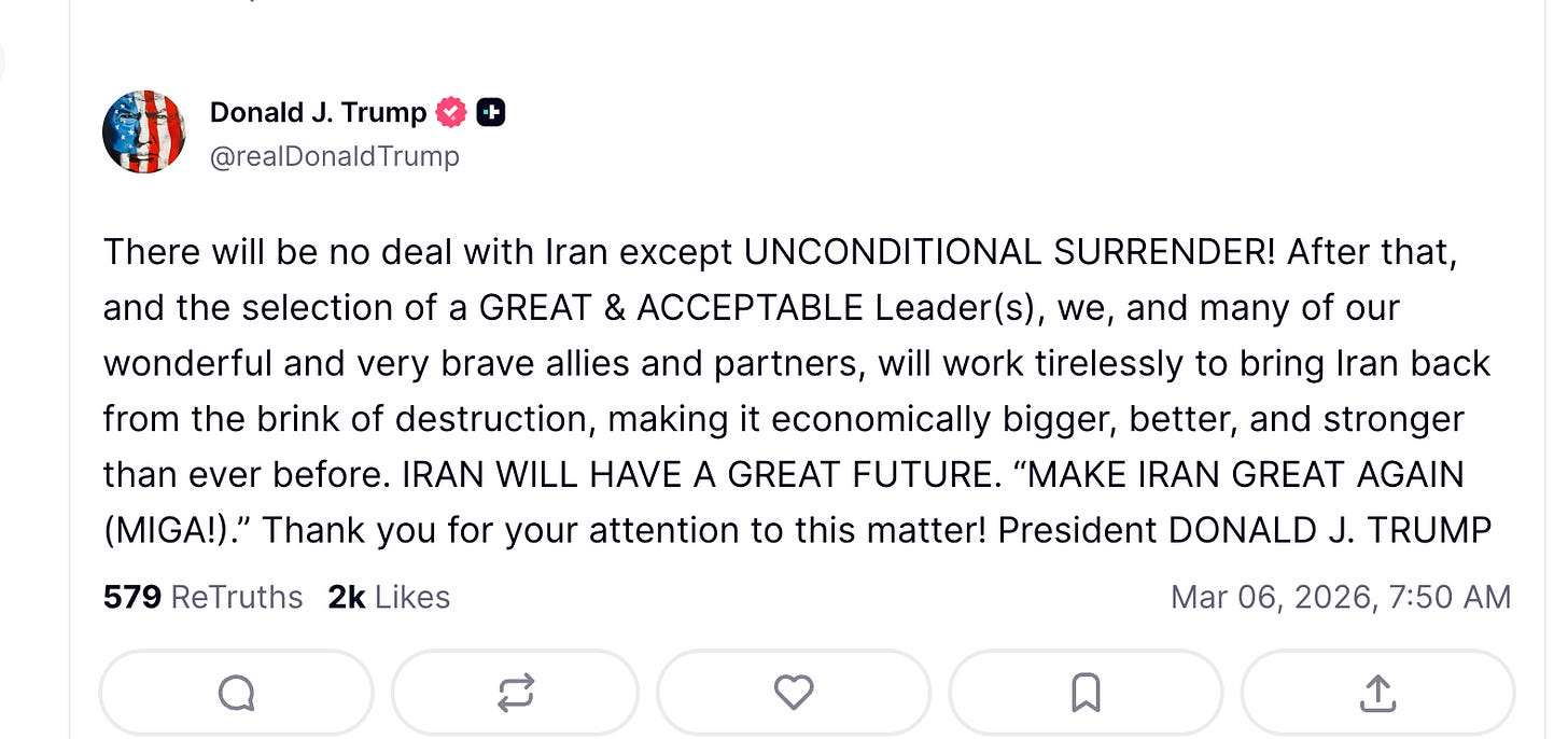 “There will be no deal with Iran except UNCONDITIONAL SURRENDER! After that, and the selection of a GREAT & ACCEPTABLE Leader(s), we, and many of our wonderful and very brave allies and partners, will work tirelessly to bring Iran back from the brink of destruction, making it economically bigger, better, and stronger than ever before. IRAN WILL HAVE A GREAT FUTURE. ‘MAKE IRAN GREAT AGAIN (MIGA!).’ Thank you for your attention to this matter! President DONALD J. TRUMP”